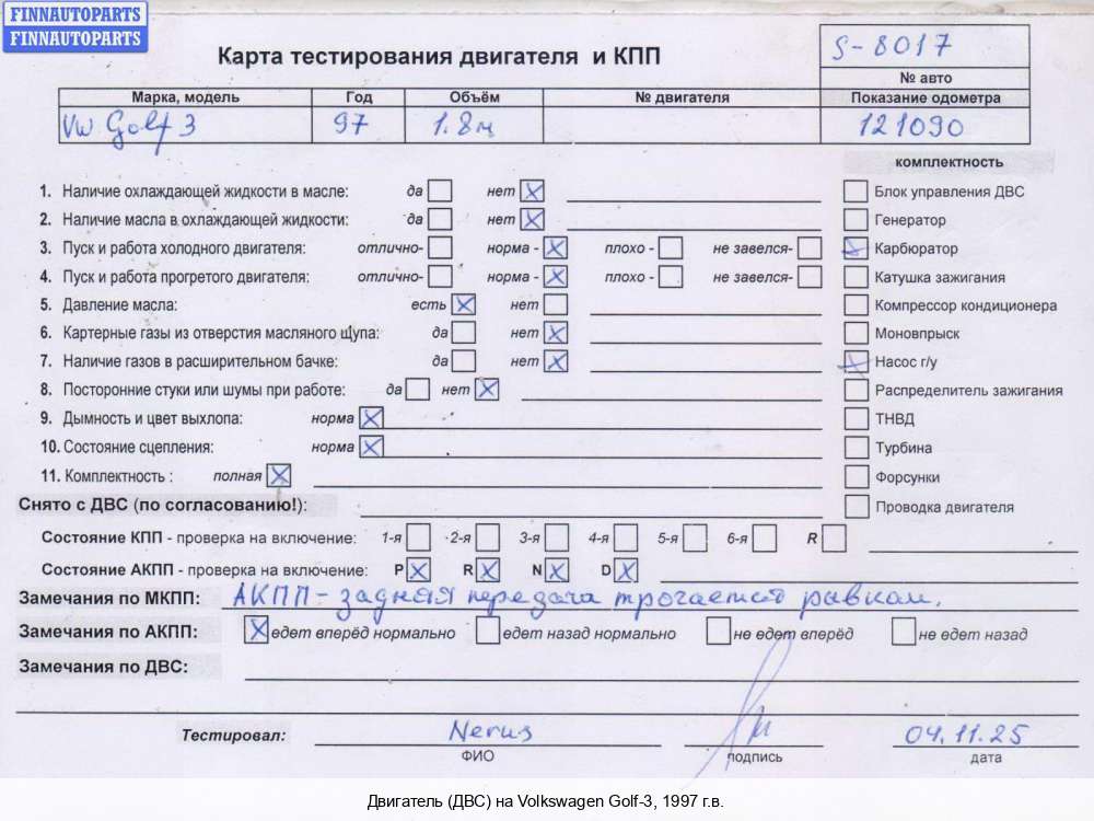 | Пенза | 1999 | 050100103CX, 1999, 1.6л, Бензин, Инжектор, AKS, AKS072628, 050100103CX, Универсал, серебристый, Фото не актуально, с запчасти отделены: Компрессор кондиционера, Генератор, Заслонка дроссельная, Распределитель зажигания (трамблер), AKS072628 | - | С | Н, прокручивается, состояние ГРМ - нормально, поддон - нормально, клапанная крышка - нормально, эмульсия - нет, бит шкив коленвала, | |||