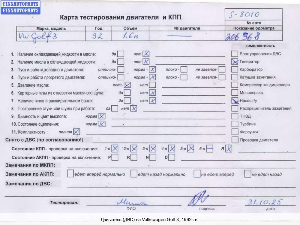 | Ростов-на-Дону | 1994 | 032100098BX, 1994, 1.6л, Бензин, Моновпрыск, AEA, Б/Н, 032100098BX, Хэтчбэк 3 дв., зеленый, Фото не актуально, с запчасти отделены: Насос гидроусилителя руля (ГУР), Генератор, Маховик, Коллектор выпускной, Распределитель зажигания (трамблер), Моновпрыск, Корпус термостата, Натяжитель приводного ремня, Б/Н | 11,5-12-11-11, прокручивается, состояние ГРМ - нормально, поддон - нормально, клапанная крышка - нормально, эмульсия - нет, 1 массовый маховик. бита крышка грм., | |||
